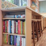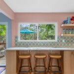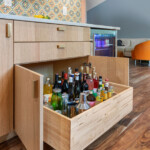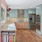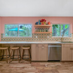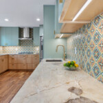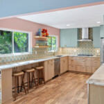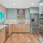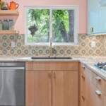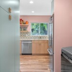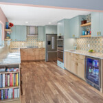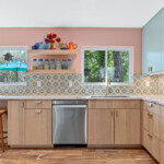 The dining area is now a cozy nook featuring custom rift sawn white oak booth seating with a matching custom tabletop, providing a perfect spot for family meals and casual conversations. The kitchen is finished with a colorful pattern tile that adds a pop of personality and charm, a testament to the homeowners’ excellent taste in selecting a beautiful color scheme.