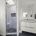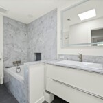 The primary suite was transformed into a true sanctuary. The primary bath remodel—taken down to the studs—boasts new vanities, marble surrounds, and luxurious finishes that evoke a spa-like retreat. Expansive walk-in closets and a private patio further enhance this serene space.