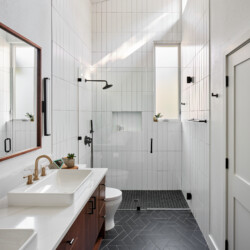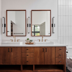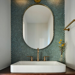 The primary bathroom showcases high ceilings, a custom walnut vanity, and brushed brass fixtures and hardware, with a walk-in shower that offers a luxurious experience. The powder bath continues the mid-century theme with a custom walnut floating vanity and a unique penny round backsplash complemented by brushed brass fixtures.
