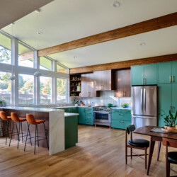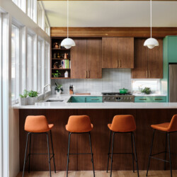 The common areas of the home now boast high ceilings, creating an open and airy atmosphere. The kitchen, a true centerpiece, features an abundance of windows that flood the space with natural light. With a mix of stained walnut cabinets and green base cabinets, beautiful quartz countertops, and cool mid-century pendant lights, the kitchen exudes style and functionality. The straight stack backsplash and brushed brass hardware add the perfect finishing touches.